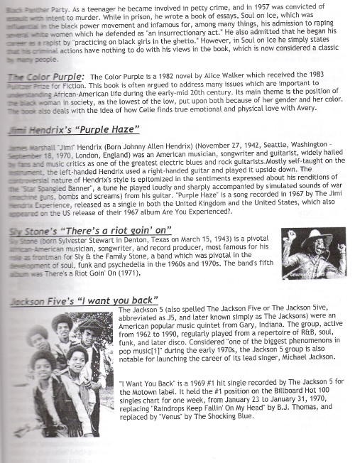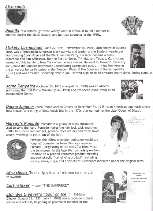 - Symbiosis: Afro comb, Dashiki, Carmichael, Kenyatta, Summer, Pomade, Afrosheen, "Soul on Ice"